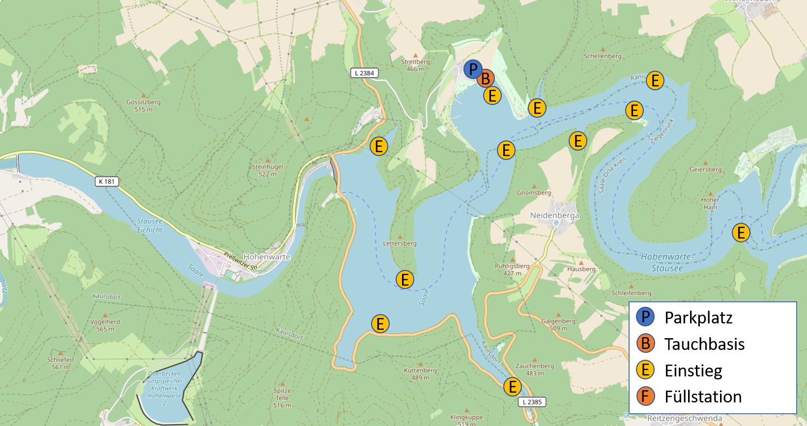 Der Hohenwarte Stausee ist ein sehr tiefes und dunkles Gewässer. Tauchgänge um die 40m sind keine Seltenheit, um die Spezialitäten der Tauchplätze zu sehen. Tauchtiefen von bis zu 55m können erreicht werden. Es werden Ausfahrten zu versunkenen Brücken und sonstigen Atrraktionen angeboten. Der Stausee bietet eine Vielzahl von Tauchgängen an.